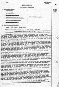 He was GSO2 Training/Air HQ British Forces Hong Kong from 16 January 1971 to 8 February 1973. He subsequently commanded A Company of the 1st Battalion in Brunei and found the Guard for the Queen’s Birthday Parade held in June 1973 in Bandar Seri Begawan. From 15 July 1974 to July 1975 he was Training Major (Chief Instructor) at Tutong Training Camp in Brunei, which was then the British Army Jungle Warfare Training School. On 14 June 1975 he again commanded the Guard for the Queen’s Birthday parade.